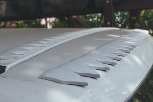私の設計するリップレスミノーは前面をスパっと切り落とした形にしてあるので、投げるとリーダーに向かって空気の渦ができて負圧が掛かります。車も同じなのです。この抵抗を少しでも減らすためにルアーの口元を三角形状に凹ませ、側面にも微妙な張り出しを設けて空気の整流をしています。