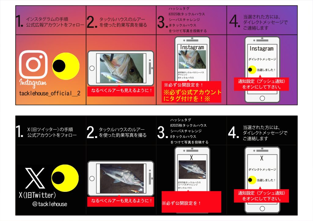キャンペーン期間内にタックルハウスのルアーで釣った(シーバス、ヒラスズキ)の釣果写真に、指定の#ハッシュタグを付けて、インスタグラム、X(ツイッター)に投稿してください。抽選で当選した方に景品をプレゼント致します。(抽選はキャンペーン終了後に行います)