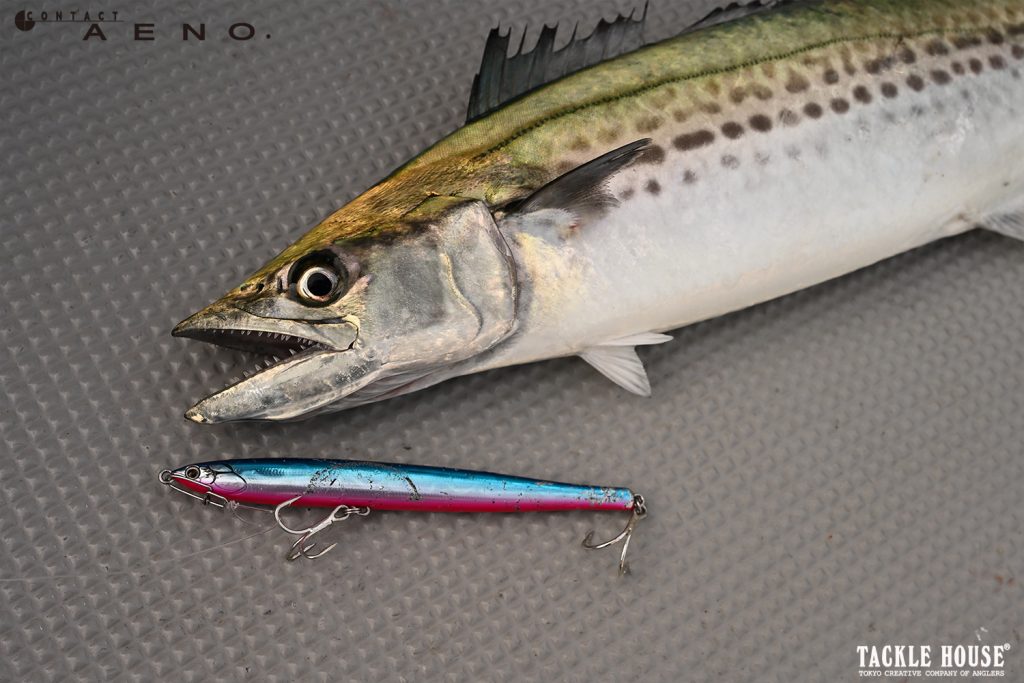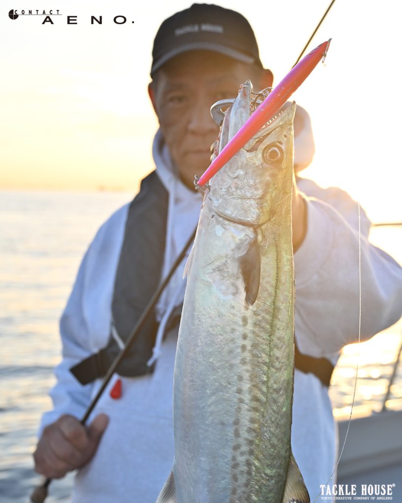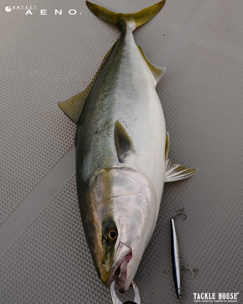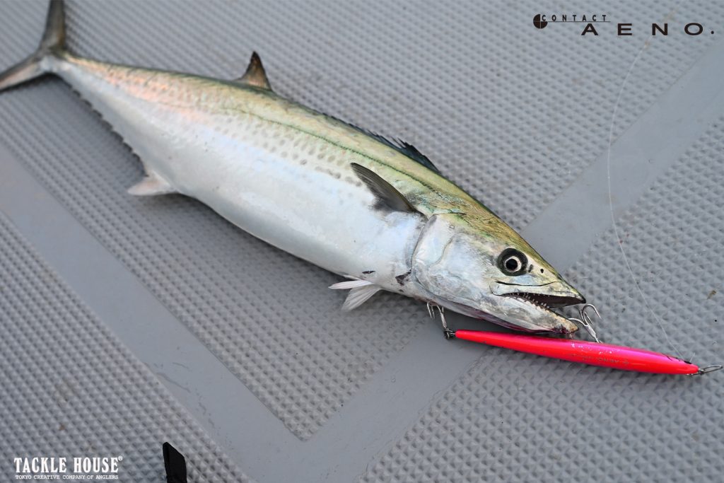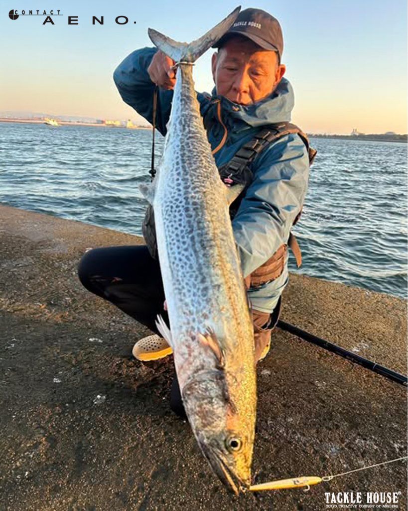 もちろんショアからでもイーノはよくヒットしておりまして、ショアからはロッドが長めになる分、ボートロッドと操作感は少し違いますが、ジャークと巻きの組み合わせは同じ、この(画像1枚目)大阪湾のデカサワラは10フィートのシーバスロッドを使ったロングジャークでヒットしました、ショアからの釣りではメタルジグ並みに飛距離が出るイーノは強力な武器になりますよ。」