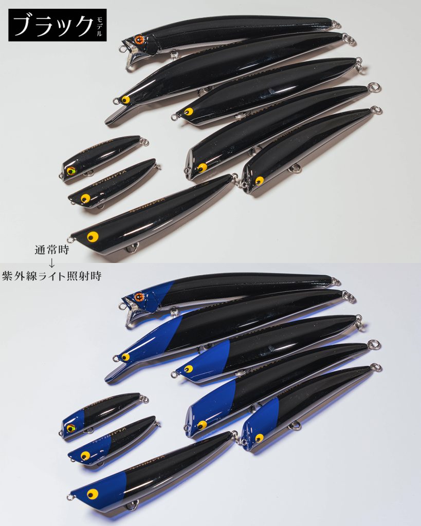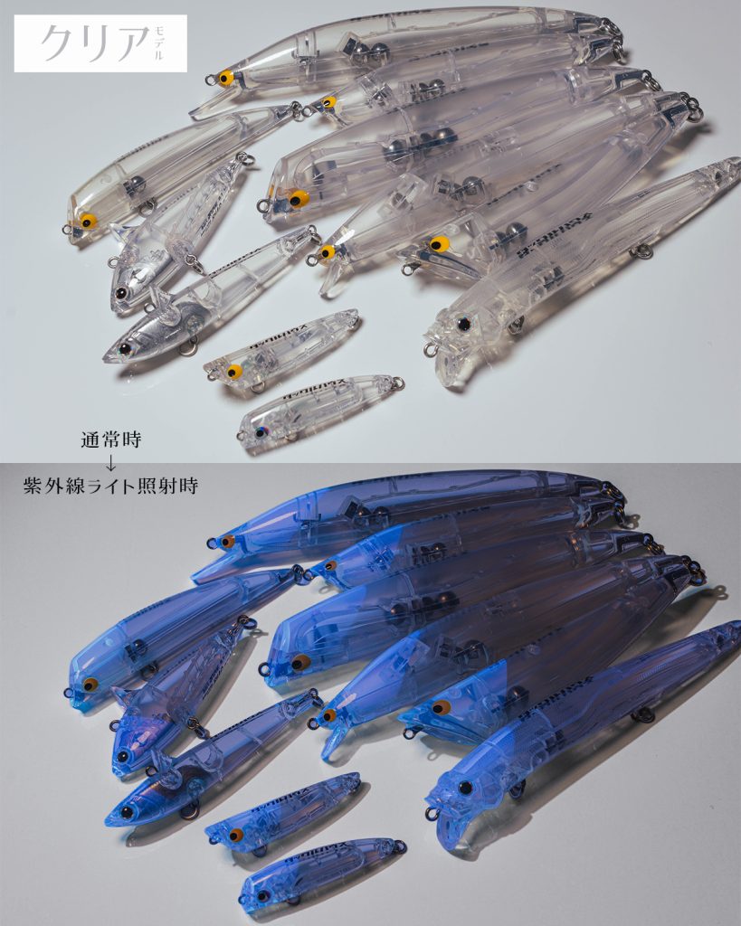 「パッと見はフルクリア or フルブラックですが、紫外線に当たるとヘッド部分のみ青白く光るユニークなカラーです。
