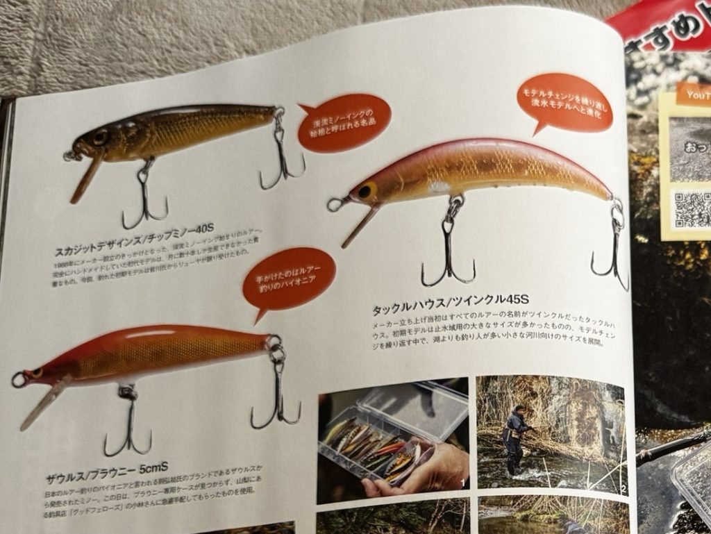 紙面、動画にて「元祖渓流ミノーでヤマメを釣りたい‼」というテーマのもと、チップミノーやブラウニーなどの名作と並んでツインクルを紹介していただいています。